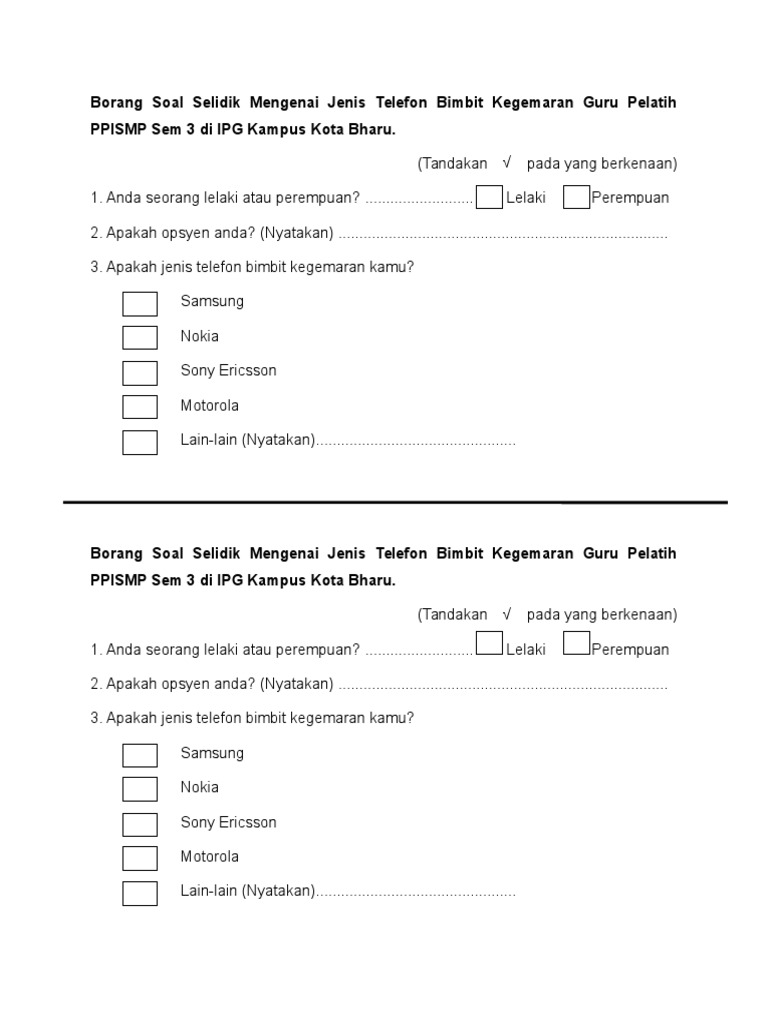 Borang soal selidik ini mengandungi empat bahagian yang terdiri daripada bahagian a, b, c dan d. Tandakan (√) pada ruangan yang disediakan. Sebanyak 836 borang soal selidik yang lengkap diisi dianalisis mengunakan program spss. Soal selidik ini adalah bagi memenuhi metadologi kajian kami bagi kursus hubungan etnik (zzzt2173). 2014 lhdn submission date hairstylegalleries.com via borang soal selidik tmt download lengkap via www.downloadlengkap.com.