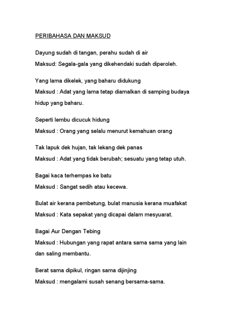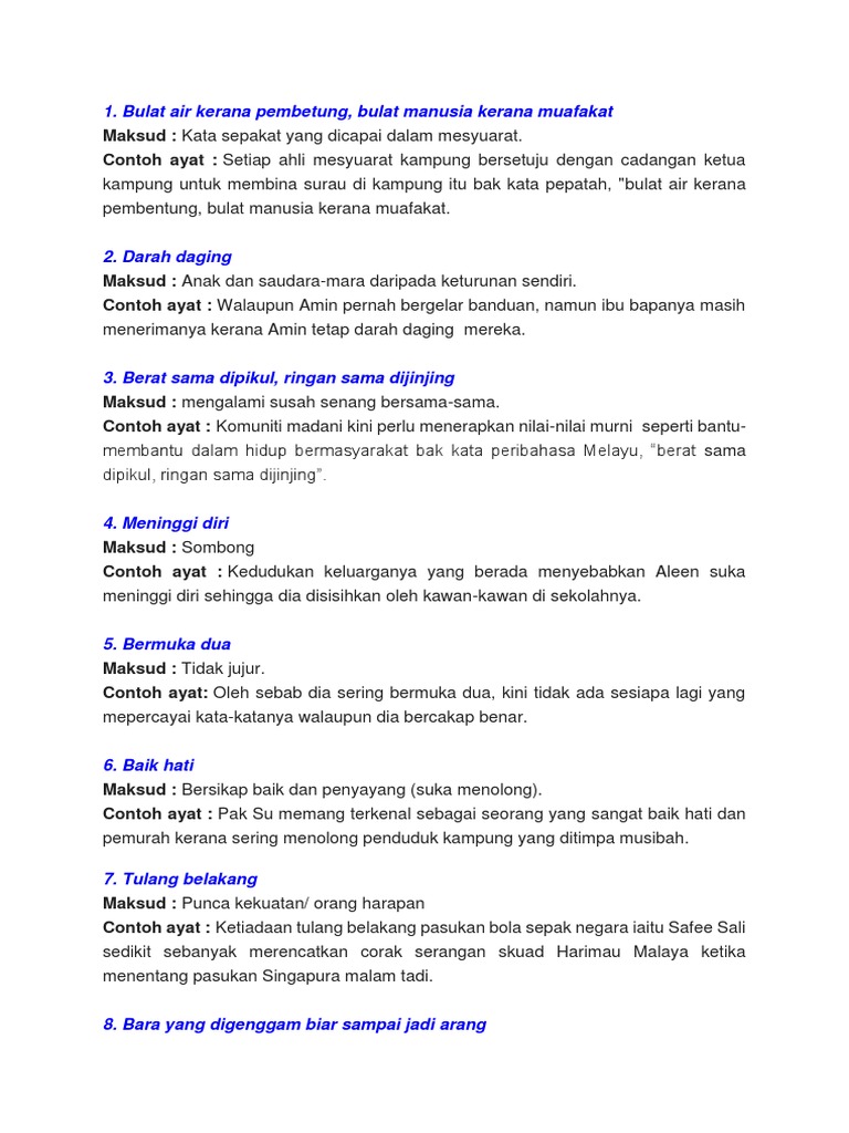 Ke bukit sama didaki, ke lurah sama dituruni 4. Hubungan yang rapat antara sama sama yang lain dan saling. Bak cendawan tumbuh selepas hujan maksud : Betung bermaksud sejenis buluh yang besar, (gambar) nama saintifiknya dendrocalamus asper; Kata sepakat yang dicapai dalam mesyuarat.