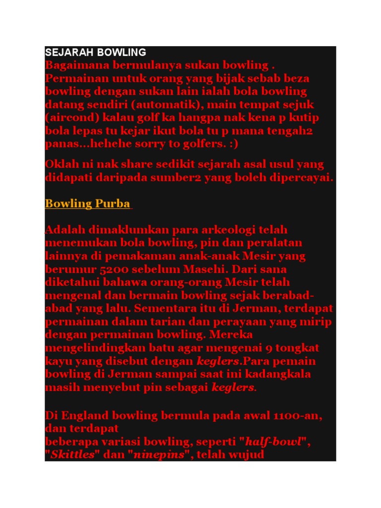Bowling adalah suatu jenis olahraga atau permainan yang dimainkan dengan menggelindingkan atau melemparkan bola dengan menggunakan tangan. Sejarah malaysia bermula pada zaman kesultanan melayu melaka iaitu sekitar tahun 1400 masihi. Bowlng alleys in malaysia directory. Sejarah bowling berawal ribuan tahun yang lalu. Disela peresmiannya, presiden jokowi menyempatkan untuk mencoba arena bowling.