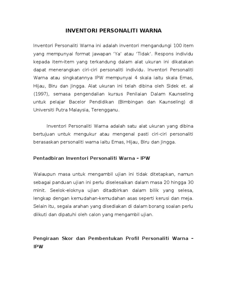 Nilaian skor inventori personaliti sidektraits personaliti sokongan skor. Inventori personaliti warna apakah ipw mengandungi 100 item (format ya atau tidak ) respons individu : Tempoh masa ini adalah yang paling dan berkesan meskipun jangka masa yang sebenar untuk menyelesaikan ujian ini tidak ditetapkan. If you complete the inventory, you will indicate your agreement or disagreement with various statements of the kind. Sidek mohd noah sarjana pendidikan (bimbingan & kaunseling).