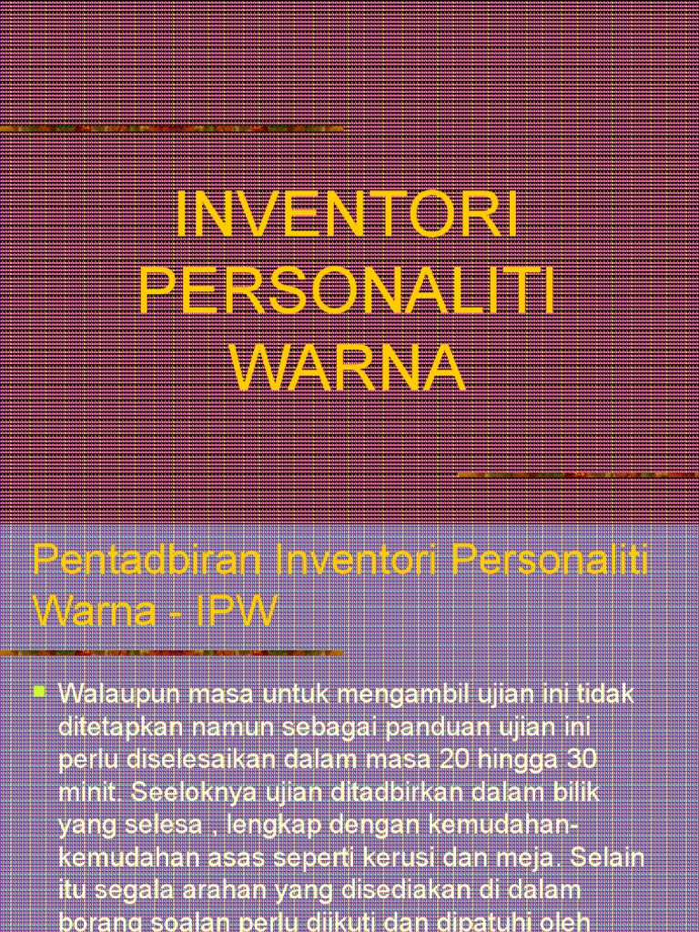 Identitas suatu warna ditentukan panjang gelombang cahaya tersebut. Share & embed inventori personaliti warna. Published by rika fadly modified over 6 years ago. Sebagai contoh warna biru memiliki panjang gelombang 460 nanometer. 2 apakah ipw… • mengandungi 100 item (format 'ya' atau 'tidak') • respons individu : Nilaian skor inventori personaliti sidek. The 3 major approaches to personality scale construction—the external, inductive, and deductive strategies—are discussed and their rationales compared. Ciri umum keibubapaan, ikut adat resam, setia,tradisional slideshow. • mengandungi 100 item (format 'ya' atau 'tidak') • respons individu : If the work is not fun, tends to avoid or drop the issue and move on to something different. Personaliti sidek (ips), inventori personaliti warna (ipw), dan inventori minat kerjaya. Ujian personaliti ini adalah ujian yang mempunyai format jawapan 'ya' atau 'tidak'. Sidek mohd noah sarjana pendidikan (bimbingan & kaunseling).