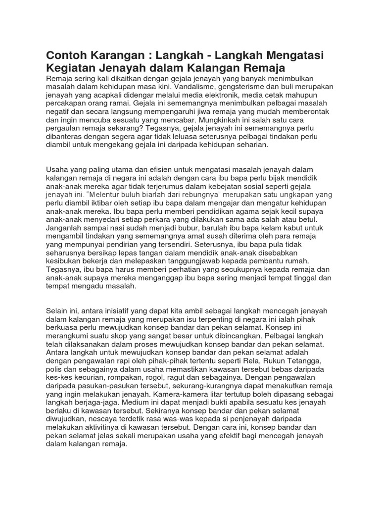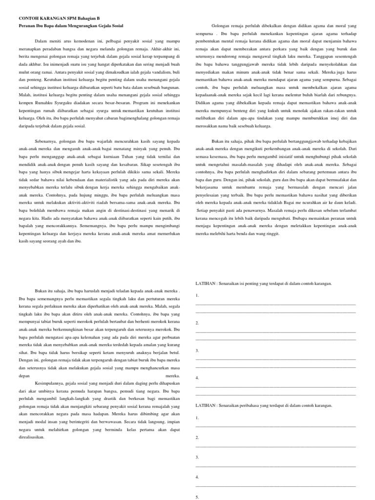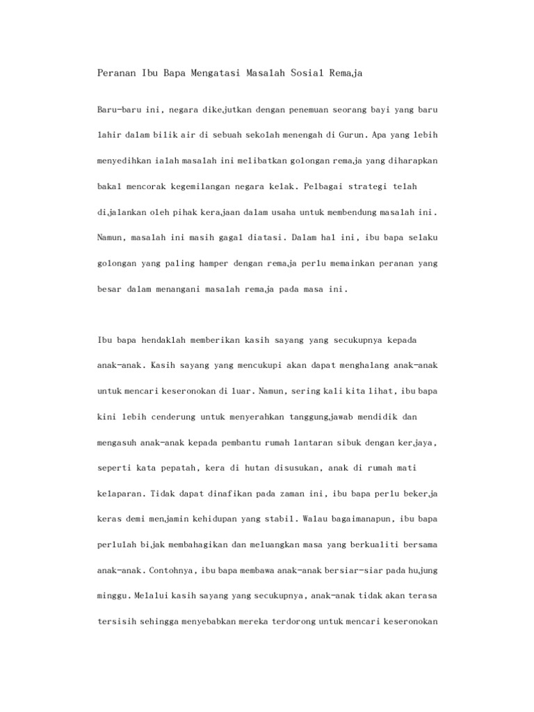 Peranan ibu bapa dalam menangani gejala sosial. Karangan dimensi keluarga remaja kini banyak menghabiskan masa dengan melayari internet yang memberikan pelbagai kesan kepada mereka. Sekali air bah, sekali pantai berubah. For more information and source, see on this link : Contoh karangan spm peranan ibu bapa untuk mengawal penggunaan internet dalam kalangan anak anak. Tanggungjawab dan peranan ibu bapa dalam menangani gejala sosial dalam kalangan remaja dalam meniti arus kemodenan ini, pelbagai penyakit sosial yang mampu meranapkan peradaban bangsa dan negara melanda golongan remaja. Kesungguhan kerajaan dalam menangani gejala sosial merupppakan satu usaha positif untuk mengawal tingkah laku pelajar. Huraikan peranan keluarga bagi menangani masalah ini. Kebelakangan ini, pelbagai gejala sosial dalam kalangan remaja yang menjadi polemik masyarakat tempatan. Peranan ibu bapa dalam mengurangkan gejala sosial kepentingan sektor pelancongan kepada rakyat dan negara Jika buruk akhlak dan sifat generasi ini, nescaya burukllah padahnya kepada negara nanti. Huraikan peranan keluarga bagi menangani masalah ini. Sorry, preview is currently unavailable.