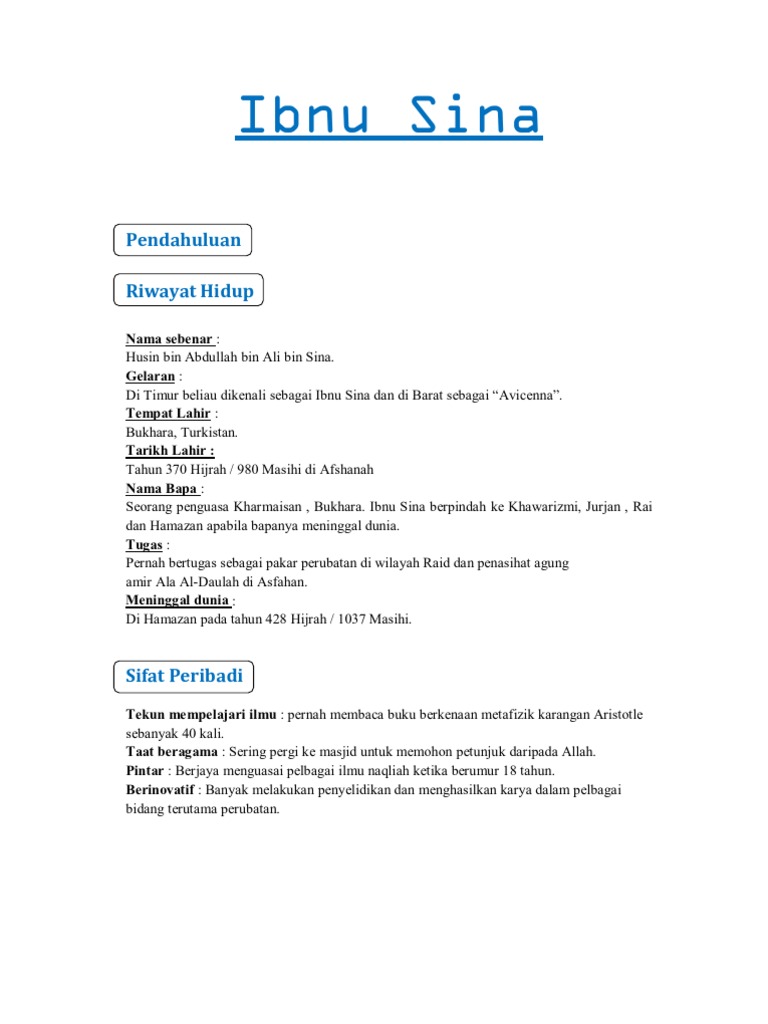 Menjelaskan sejarah ketokohan ibnu sina. Sifat peribadi ibnu sina ibnu sina merupakan seorang yang tekun dalam mempelajari ilmu. Mari menengok biografi ibnu sina, sang bapak. Sifat peribadi ibnu sina merupakan seseorang yang tekun dalam mempelajari ilmu, beliau pernah membaca buku metafizik karangan aristotle sebanyak 40 kali. Bagi ibnu sina sifat wujudlah yang terpenting dan yang mempunyai kedudukan diatas segala sifat lain, walaupun essensi sendiri.